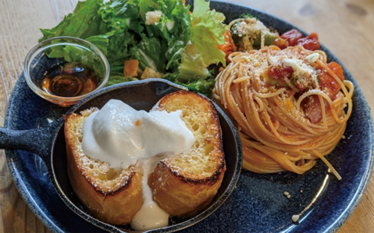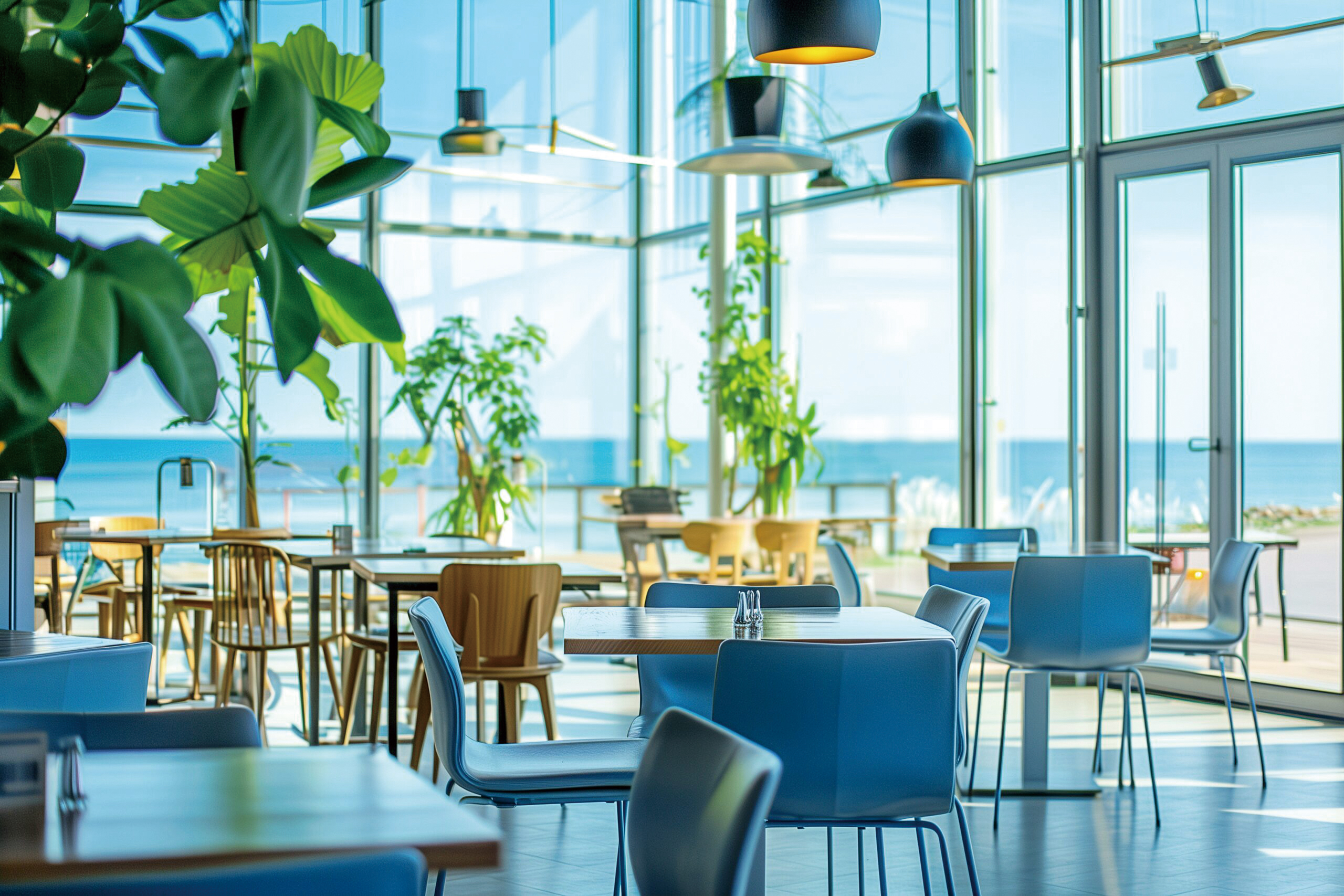 光が差し込む開放的な空間に、緑あふれるカフェスペース。