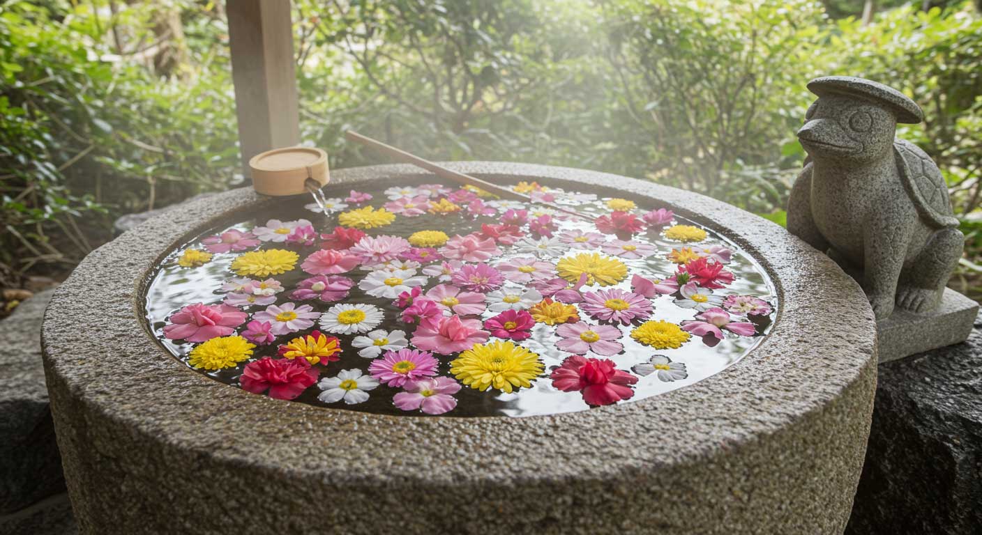 四季のお花が浮かぶ「河童の花手水」は湯膳の新名物。
