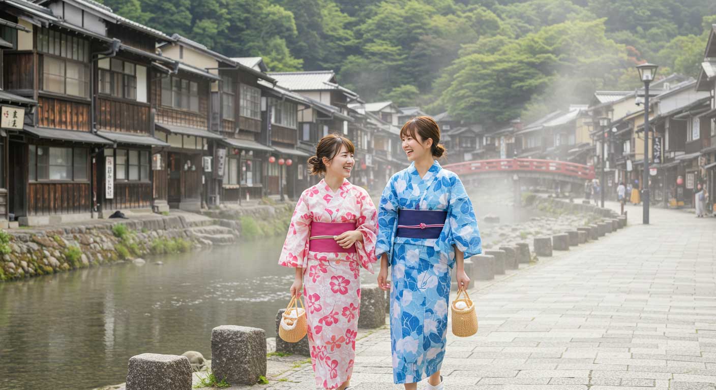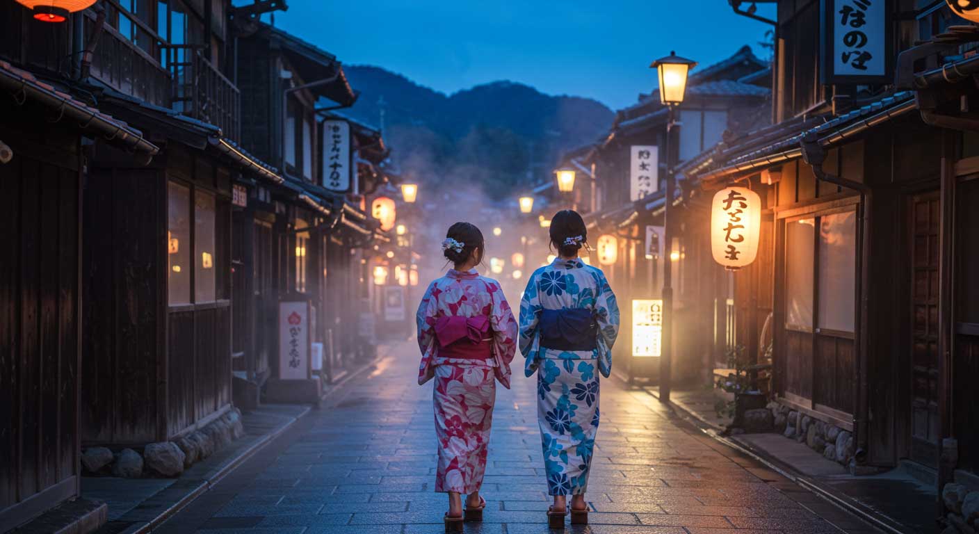 浴衣で歩く温泉街。