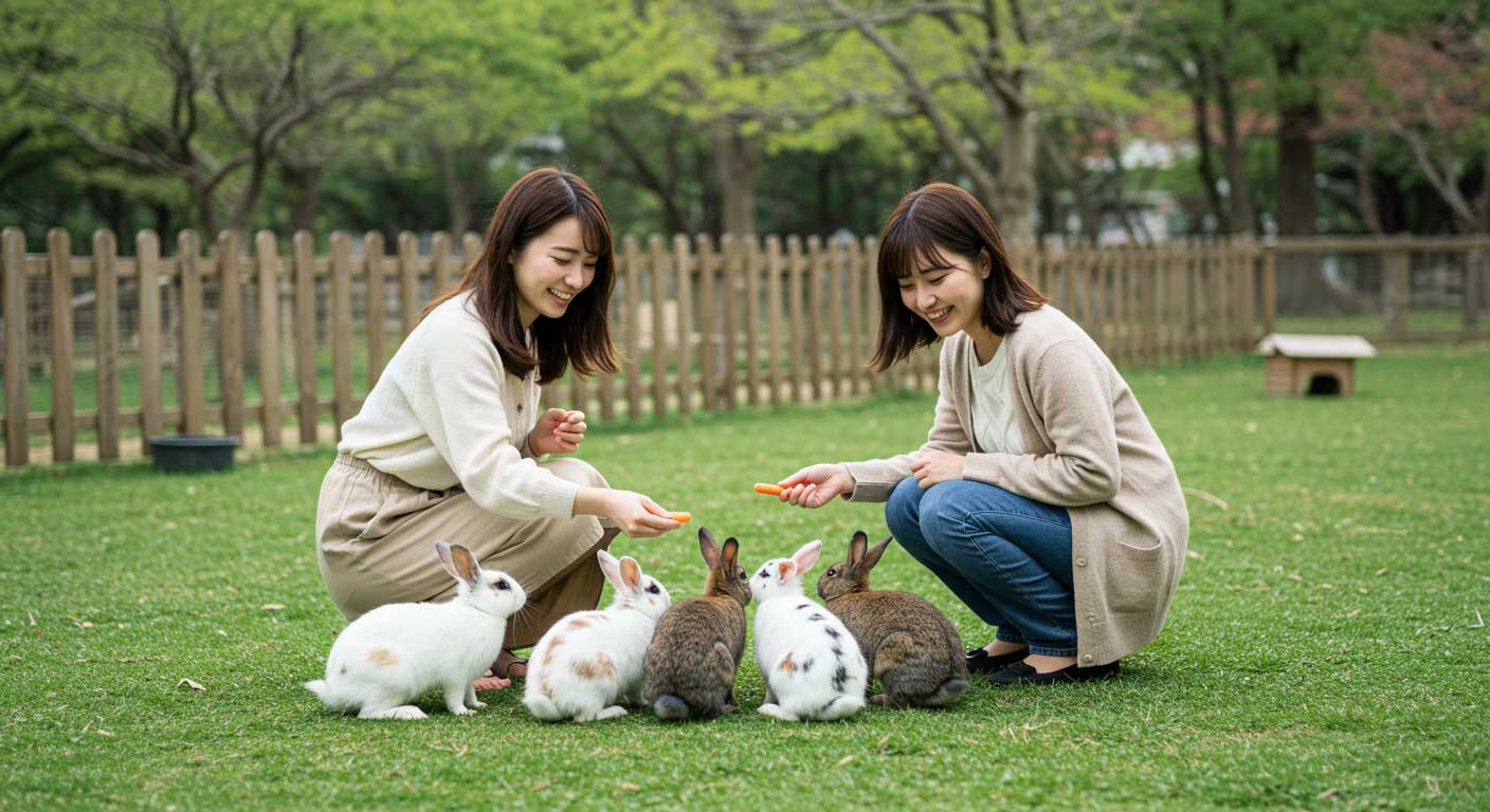 ふわふわのうさぎたちにエサをあげて、癒しのひととき。